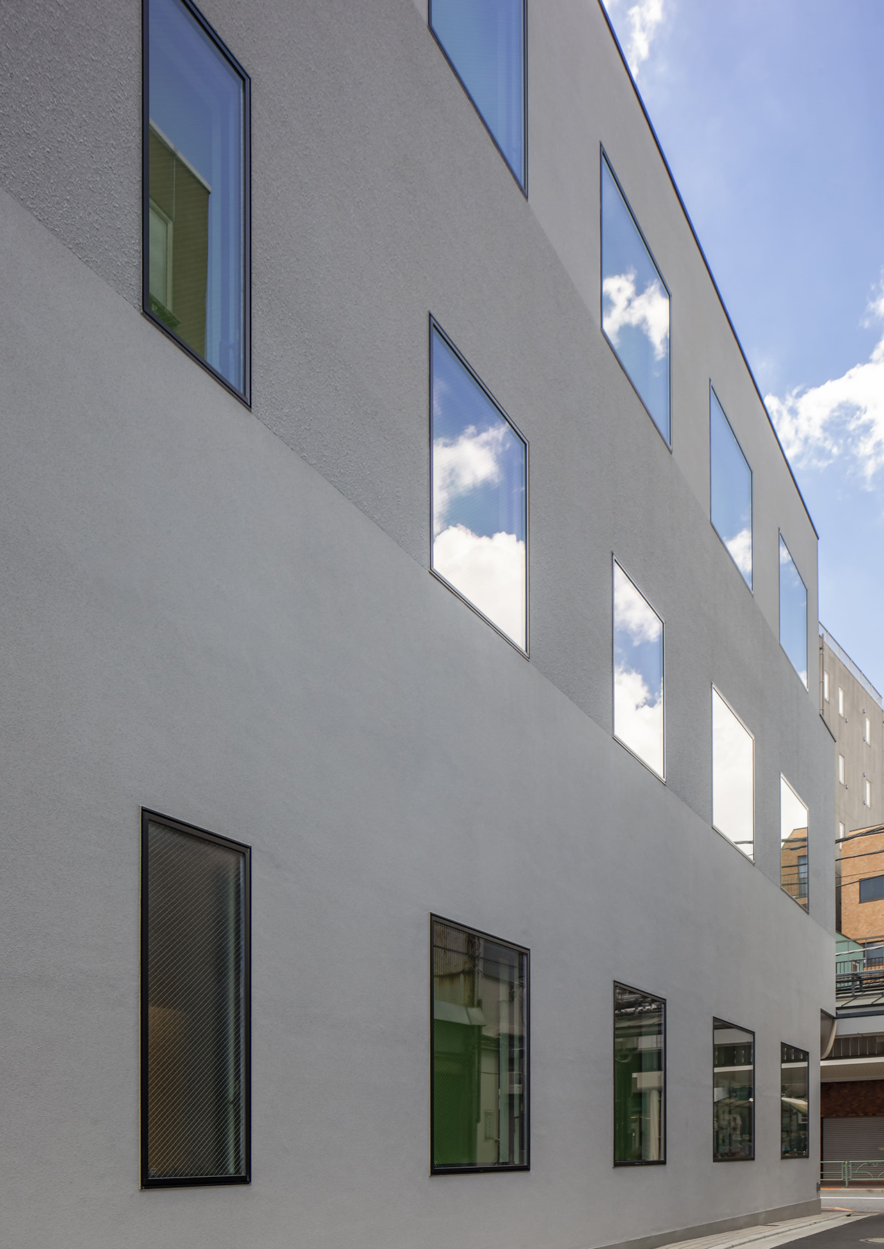 住宅の象徴である「窓」をファサードの主要なデザイン要素とし、その窓からブランドカラーである緑色をのぞかせることで、企業のアイデンティティを視覚的に表現した。窓の寸法や外壁のテクスチャーの切り替えによって、オフィスビルでありながら住宅のスケール感を取り入れ、周囲の街並みとの調和を図った。